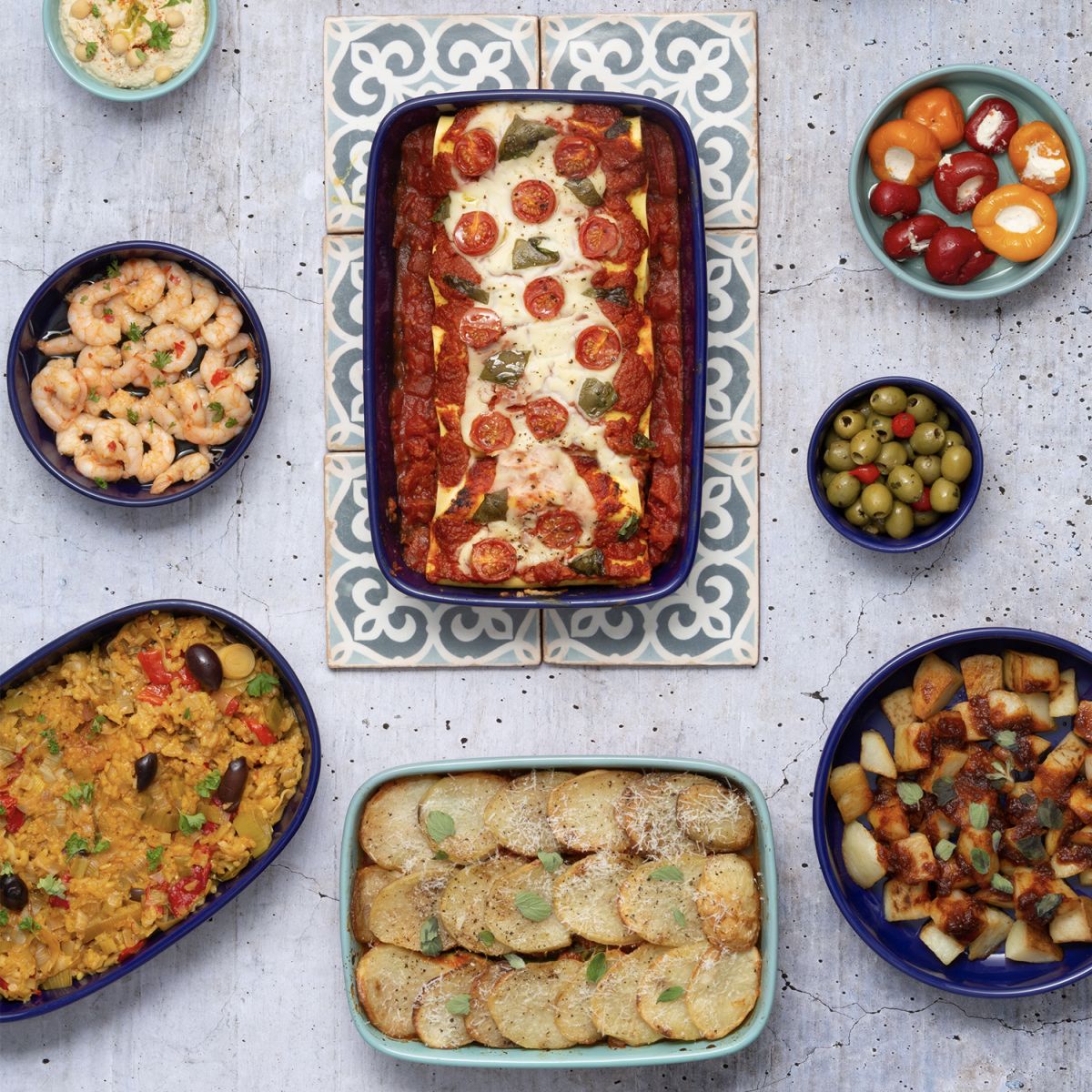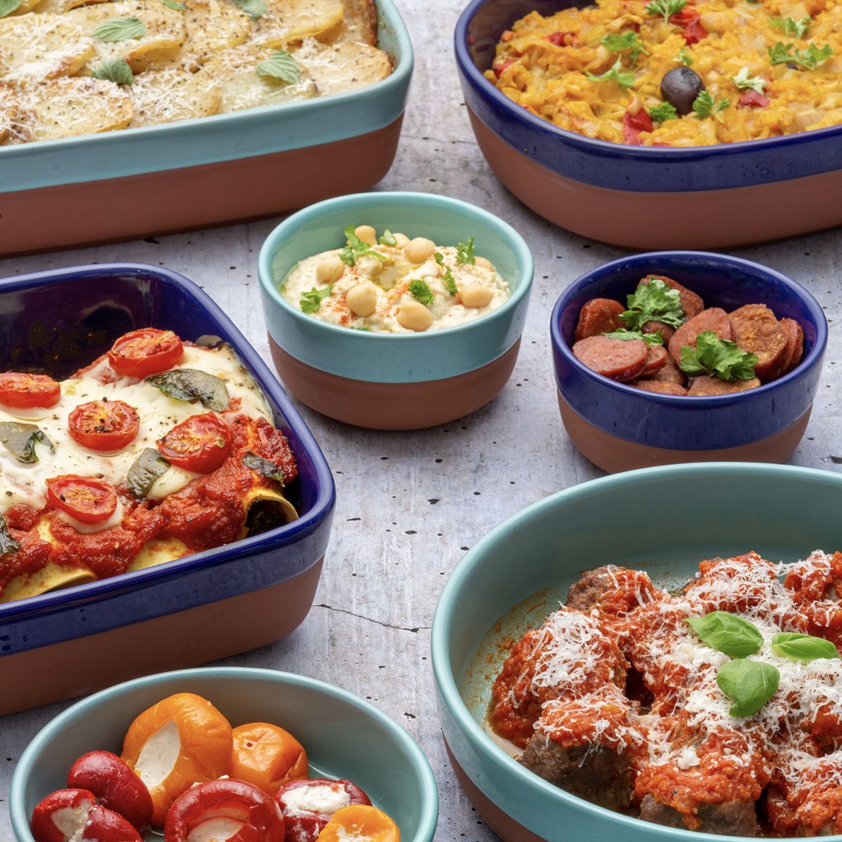 Die Terrakotta-Serie World Foods von Typhoon ist inspiriert von der mediterranen Küche. Verschiedene Größen und Formen bieten vielfältige Variationen zum Braten, Backen und Kochen von Tapas-Gerichten und mehr.Zubereiten - im Ofen garen und direkt in der Terrakotta Form servieren. Das mediterrane Flair sorgt für Geschmacksvielfalt und Urlaubsfeeling.Hergestellt aus natürlicher Terrakotta, wurde jedes Stück mit einer hell- oder dunkelblauen Glasur im Tauchverfahren veredelt und bringen Farbe und Lebendigkeit auf jeden gedeckten Tisch.Die Tapas-Schale eignet sich perfekt zum Zubereiten und Servieren einer Reihe von kleinen Tellern wie Fleischbällchen, Patatas Bravas und Knoblauchgarnelen und vielem mehr.Die Auflaufformen sind backofenfest bis 230⁰C und sind ideal zum Servieren direkt auf dem Tisch geeignet. Stilvoll, köstlich und vielfältig.