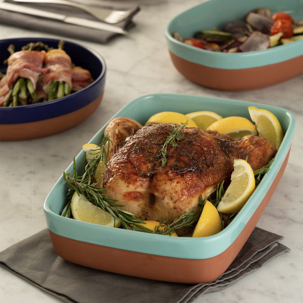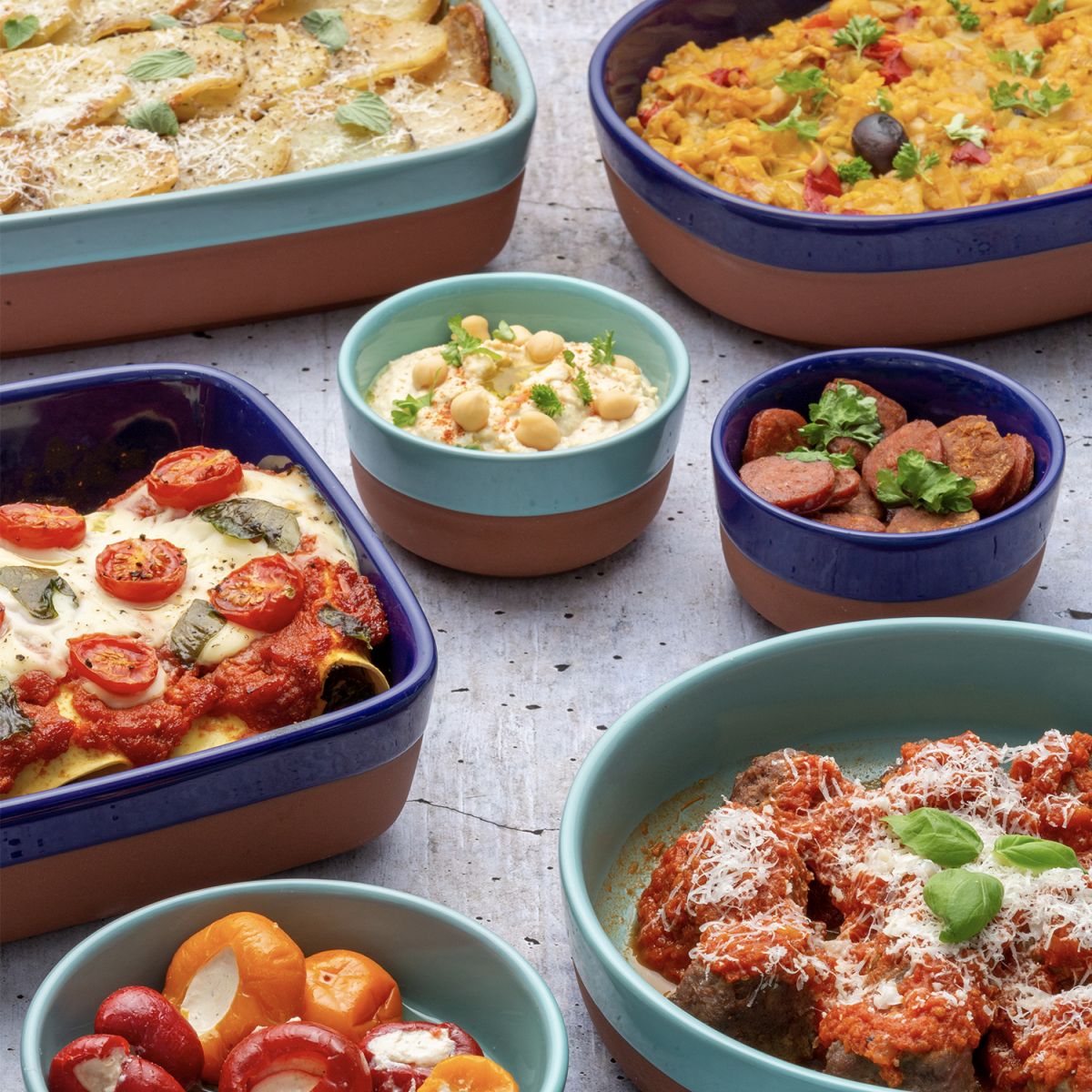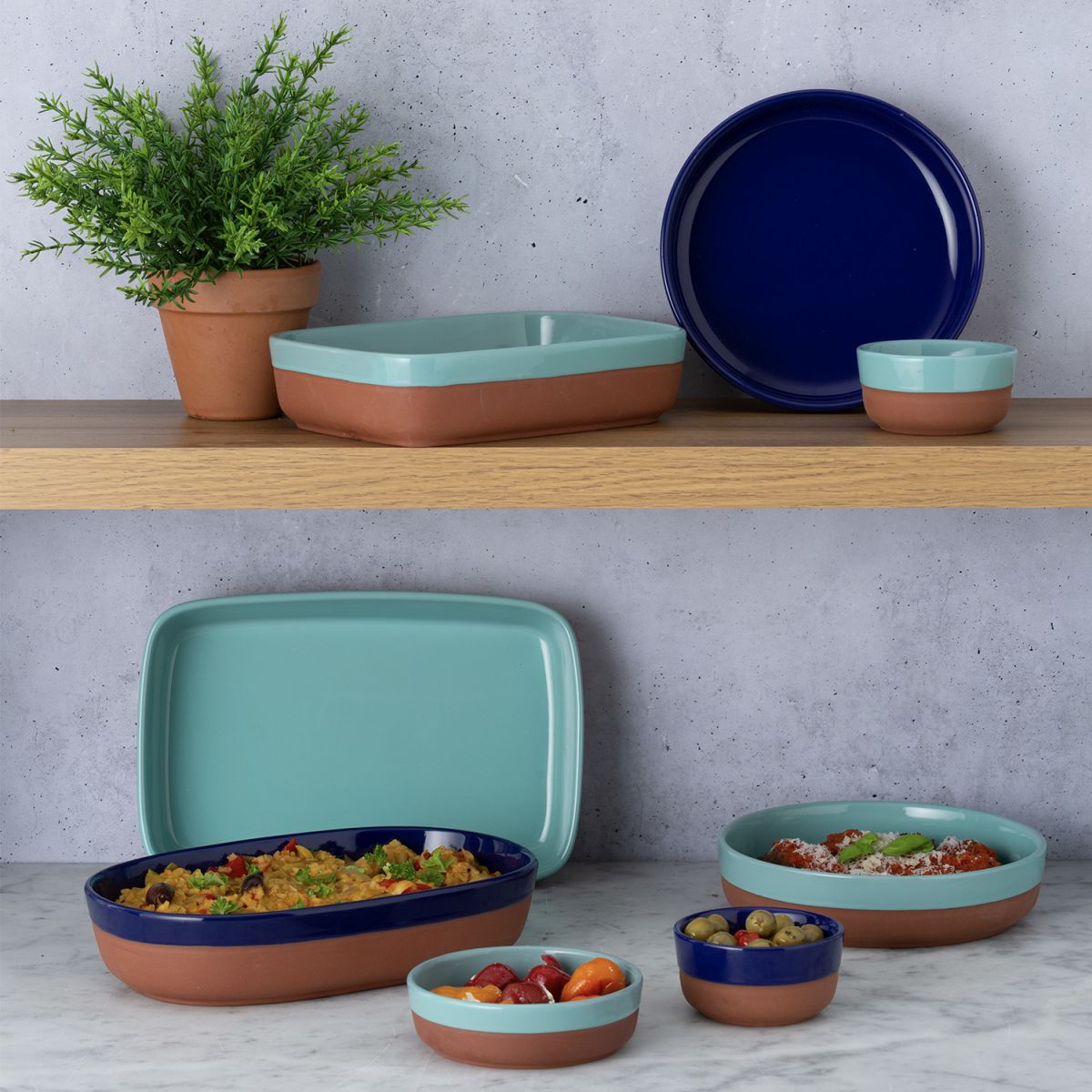 Die Terrakotta-Serie World Foods von Typhoon ist inspiriert von der mediterranen Küche. Verschiedene Größen und Formen bieten vielfältige Variationen zum Braten, Backen und Kochen von Tapas-Gerichten und mehr.Zubereiten - im Ofen garen und direkt in der Terrakotta Form servieren. Das mediterrane Flair sorgt für Geschmacksvielfalt und Urlaubsfeeling.Hergestellt aus natürlicher Terrakotta, wurde jedes Stück mit einer hell- oder dunkelblauen Glasur im Tauchverfahren veredelt und bringen Farbe und Lebendigkeit auf jeden gedeckten Tisch.Die Tapas-Schale eignet sich perfekt zum Zubereiten und Servieren einer Reihe von kleinen Tellern wie Fleischbällchen, Patatas Bravas und Knoblauchgarnelen und vielem mehr.Die Auflaufformen sind backofenfest bis 230⁰C und sind ideal zum Servieren direkt auf dem Tisch geeignet. Stilvoll, köstlich und vielfältig.